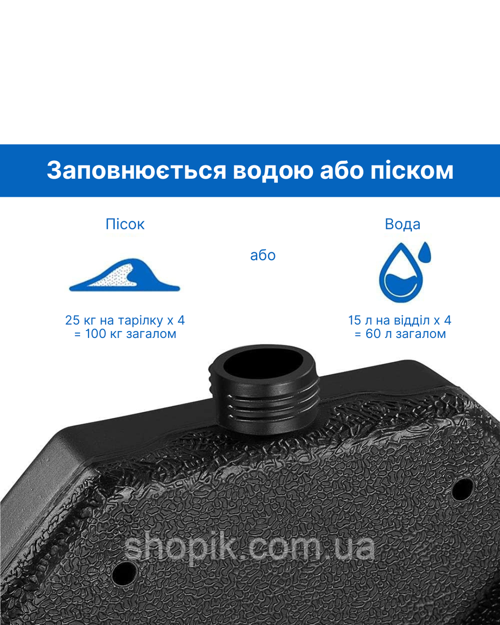 - Вага до 80 кг (піском) — надійне утримання.